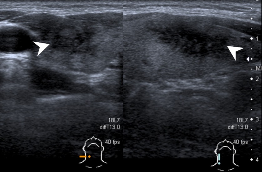 ▲甲狀腺超音波可以看到發炎部位呈現低迴音。